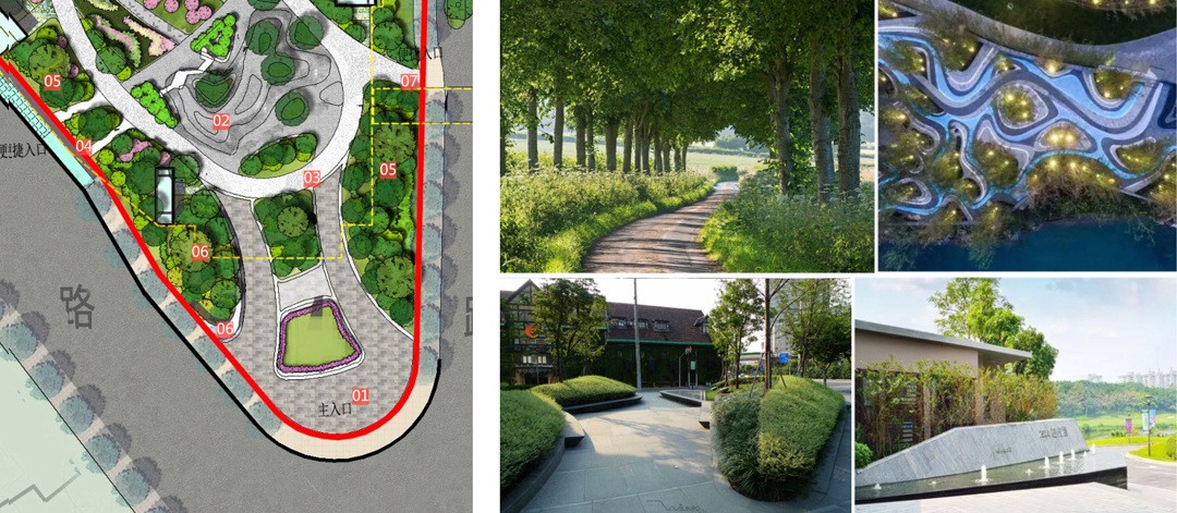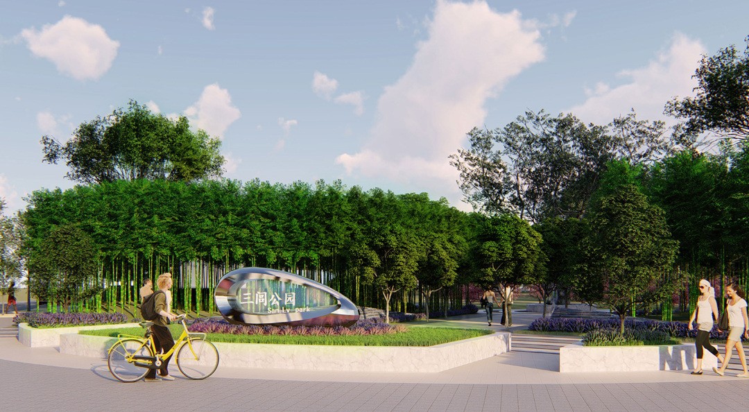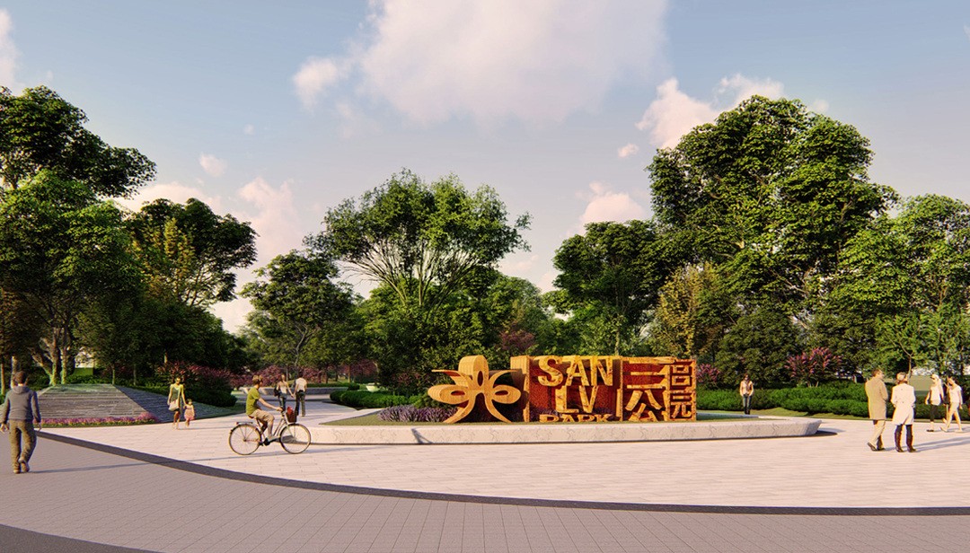三閭公園整體呈三角形,三邊均是市政道路,其中東側隔紅旗路與市委大院相望,場地內地下為人防空間,設計以“源溪行”為靈感來源,場地東西兩側設計微地形,中央形成谷地,塑造山水空間意境的同時也融入了“海綿城市”理念,并且利用兩側微地形及植栽讓公園的功能空間與城市車流相隔離,營造相對幽靜的空間感受。公園采用開放式設計,在三個路口設計公園主要入口,并設計公園LOGO墻,同時延市政路共設計五個便捷入口,以提高游園的便利性,主要園路設計為3米寬。