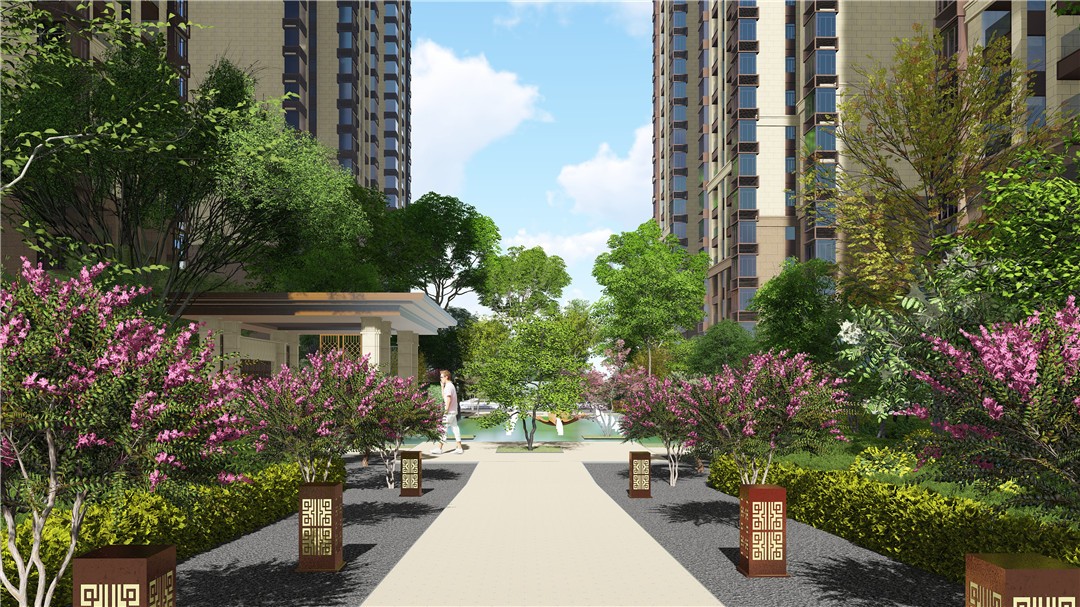 本項目位于陜西西咸新區灃西新城核心區,商業為中式風格,材質為米色石材灰色鋁板結合玻璃幕墻,住宅為新古典主義風格,材質以米灰色涂料和深棕色石材為主;景觀在新古典主義風格上有所創新;景觀在材質上與建筑相呼應注重品質、品味,有文化上的共鳴,對居住環境從形到境,追求自由生活、貼近生活本源。